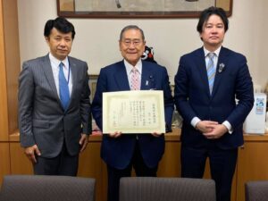 10月12日、全国介護事業者政治連盟の久野会長と斉藤理事長、全国小売酒販政治連盟の水口事務局長・理事が議員会館の事務所に推薦状をお持ちになれました。