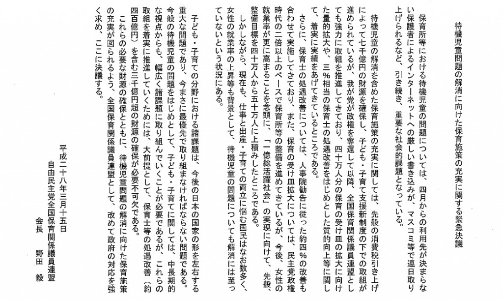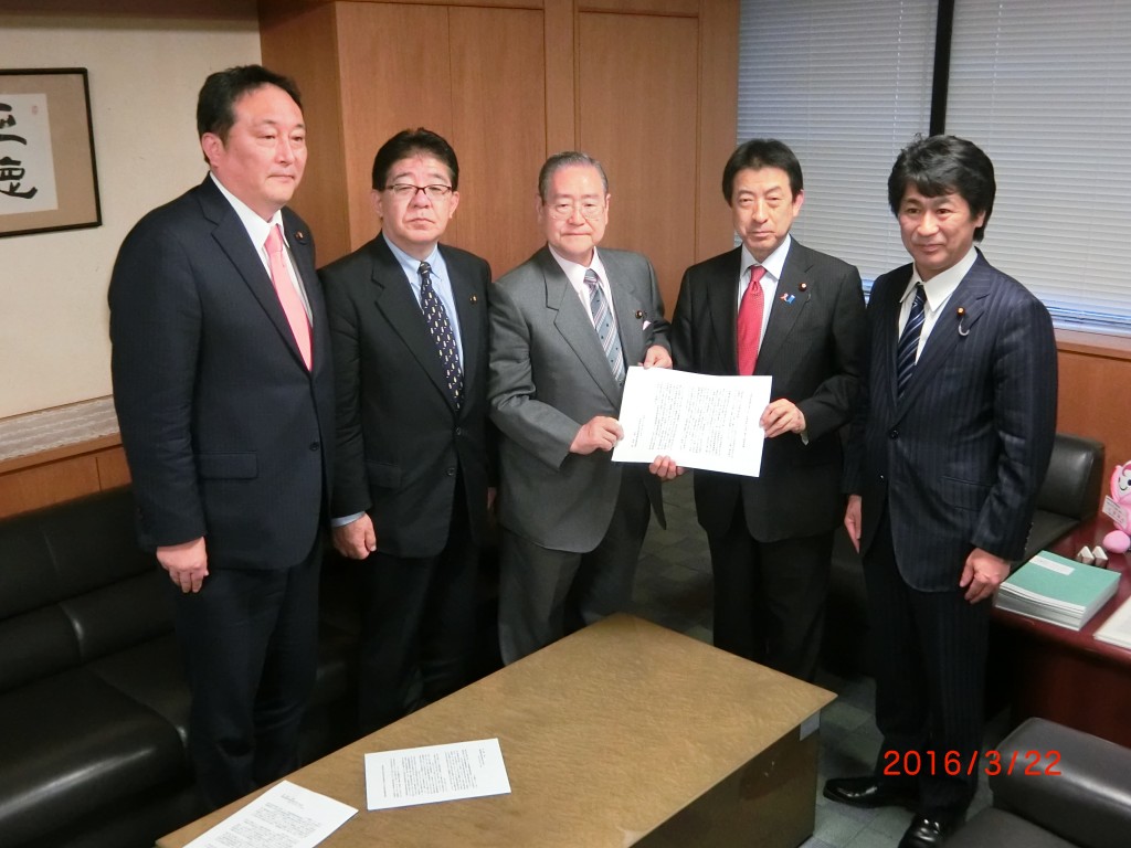平成28年3月22日、塩崎厚労大臣、加藤1億総活躍担当大臣、稲田政調会長と面会し、自民党全国保育関係議連で採択した「待機児童問題の解消」を求める緊急決議を提出いたしました。