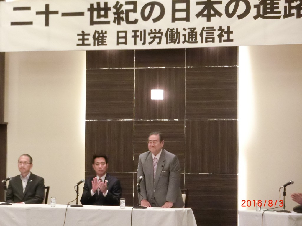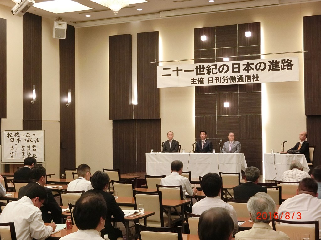 8月3日、メルパルク東京にて、日刊労働通信社「二十一世紀の日本の進路」夏季特別トップセミナーで、「転機に立つ日本の政治」と題し、政治評論家・浅川博忠氏、司会のもと、前原誠司衆議院議員、神津里李生「連合」会長と共にパネルディスカッションを致しました。