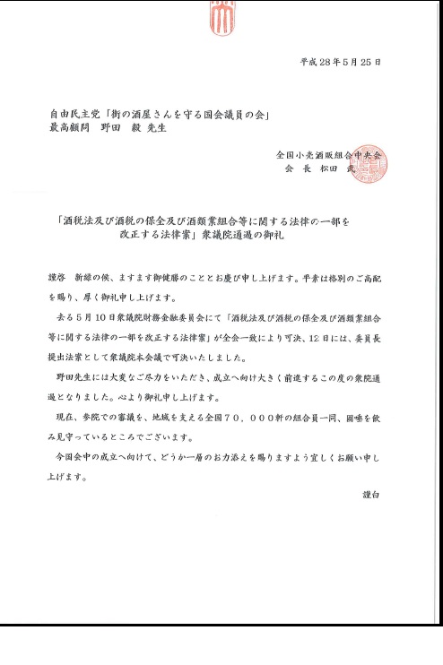 自民党「街の酒屋さんを守る国会議員の会」最高顧問として、今後とも皆さまのお役に立てるよう最大限努力致します。