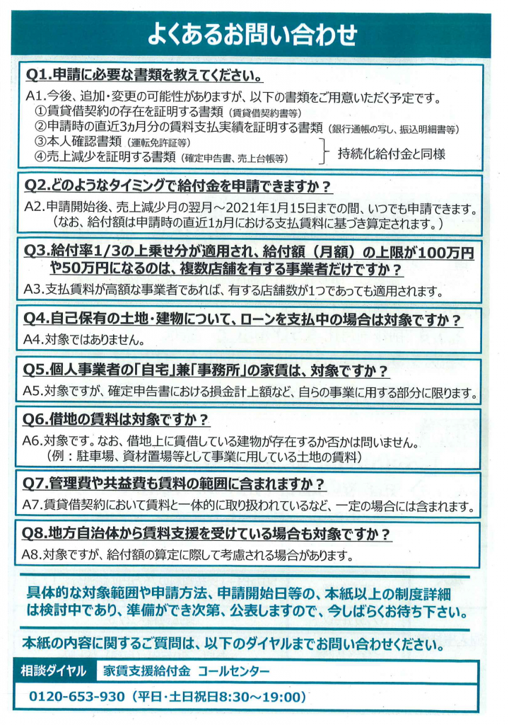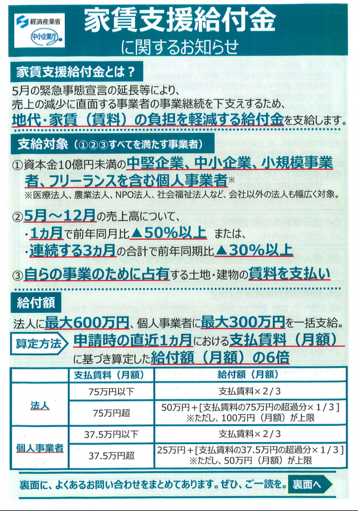 ※申請要領は、経済産業省ホームページの新型コロナウイルス関連の支援策ページ中、「家賃給付金」の項目において公表されております。ご参考下さい。
