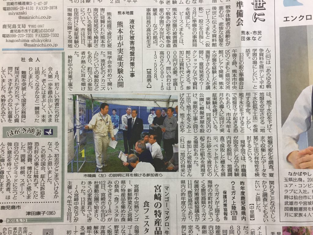 活動報告 液状化・地盤対策工事実証実験視察2018.05.22活動報告5月12日に、開催されました液状化・地盤対策工事の実証実験の検証会を視察致しました。この実証実験が新聞に記載されましたのでご報告申し上げます。皆様の安心・安全も守るべく今後も尽力して参ります。 野田たけし公式LINE登録はこちらから野田たけし公式Twitterはこちら富合町硴江(かきのえ)視察前の記事「所有者不明土地等特命委員会 とりまとめ」次の記事