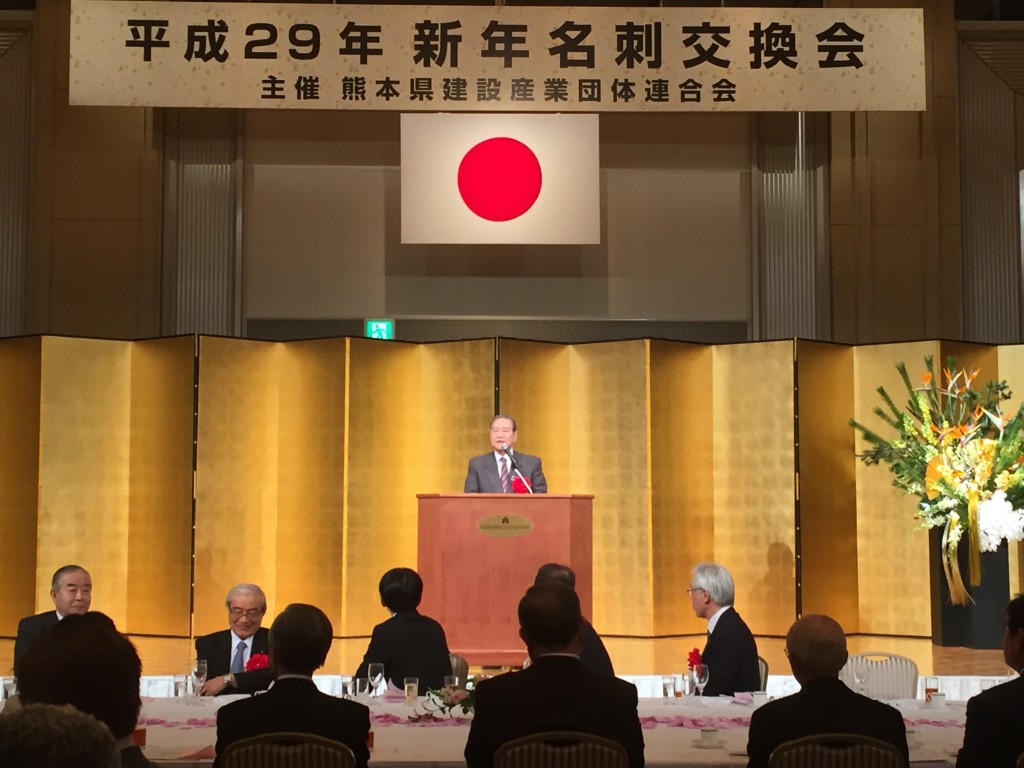 1月11日、ホテル日航熊本で行われました熊本県建設産業団体連合会の名刺交換会に出席し、「公共工事品質確保に関する議員連盟」の最高顧問として挨拶致しました。