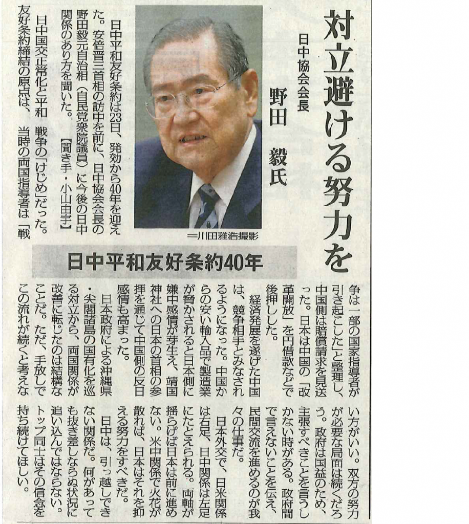 活動報告 「日中平和友好条約40年」インタビュー記事掲載2018.10.24活動報告10月24日、毎日新聞 朝刊に「日中平和友好条約40年」のインタビュー記事が掲載されました。是非ご覧ください。野田たけし公式LINE登録はこちらから野田たけし公式Twitterはこちら『日曜スクープ』 生放送出演情報前の記事日中首脳会談「私の視点」インタビュー記事掲載次の記事