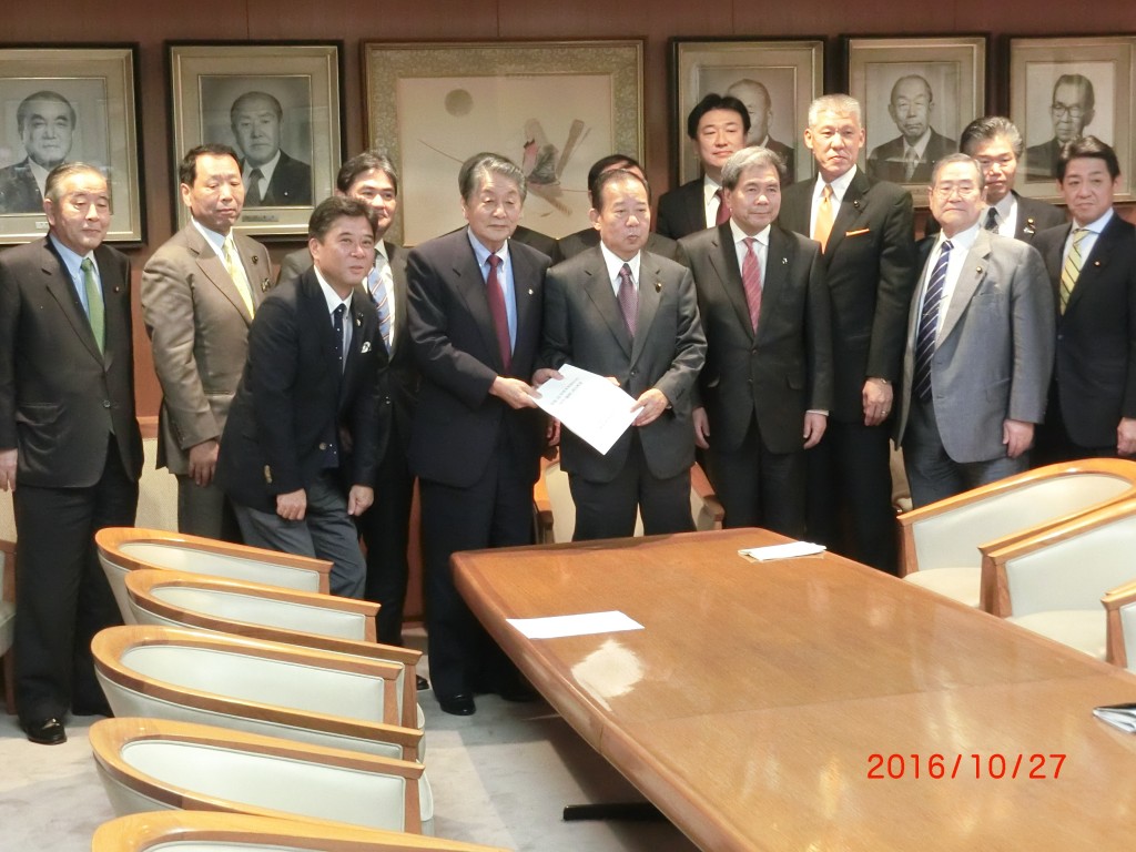 その後、党本部にて、県執行部と県選出国会議員で今後の政策要望について話し合い、総裁応接室にて、二階自民党幹事長と面会し、熊本地震からの復旧・復興に係る要望を渡しました。