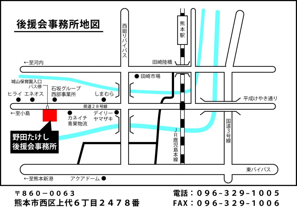 お知らせ 選挙事務所の場所について2017.10.12お知らせ選挙事務所の場所は、 熊本市西区城山上代6丁目2478 (ナビでは表示されない場合があります) 城山保育園入口バス停前です TEL 096-329-1005 / FAX 096-329-1006 ▲クリックで拡大Googleマップはこちら九州中部商工連合会の皆さま来所前の記事本日国会開会・当選後初登院次の記事