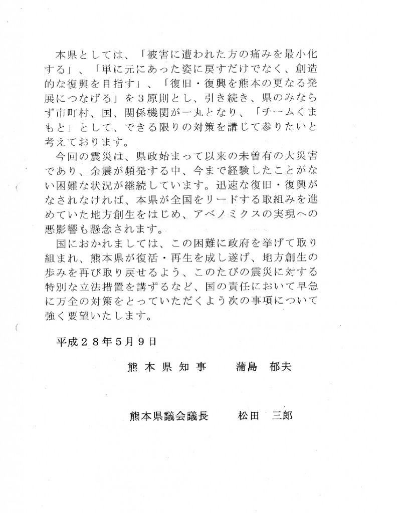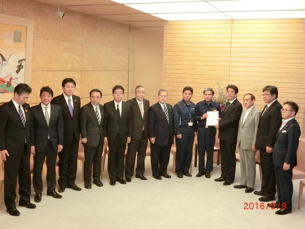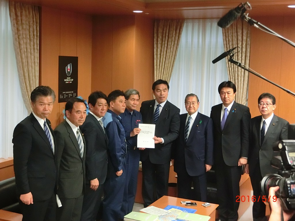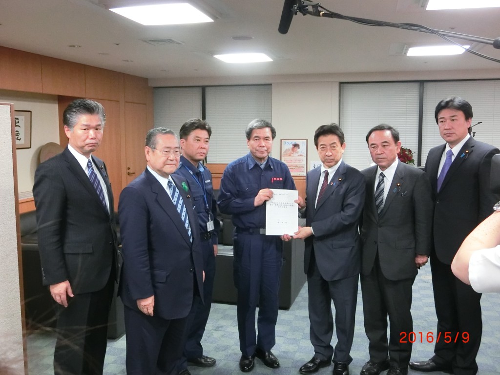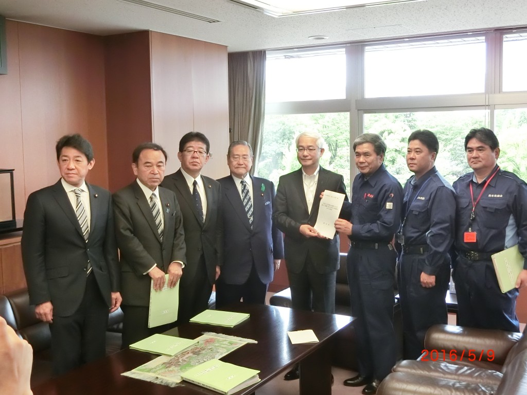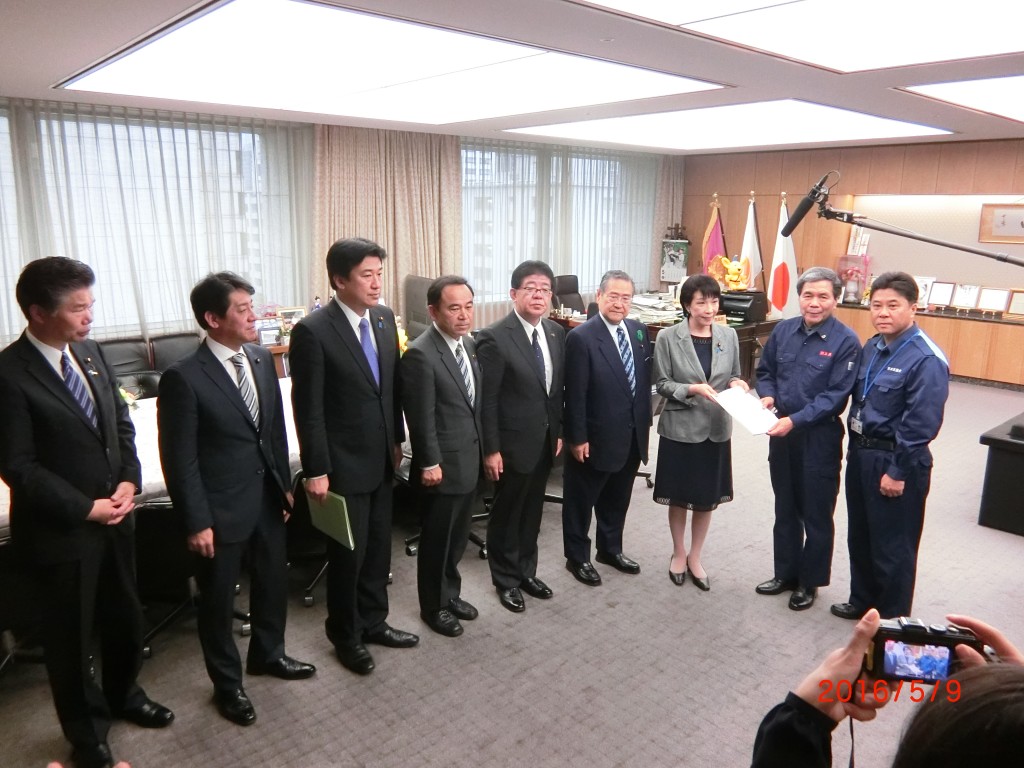 5月9日、蒲島熊本県知事、松田県議会議長、前川自民党県連幹事長と県選出国会議員の会「チーム熊本」で、官邸で総理、官房長官、各省庁で森山農水大臣、石井国交大臣、徳山国交事務次官、河野防災担当大臣、高市総務大臣、馳文科大臣、丸川環境大臣、塩崎厚労大臣、自民党本部で自民党谷垣幹事長、二階総務会長、に「平成28年熊本地震からの復旧・復興に係る特別の処置を求める要望」を申し入れに行きました。