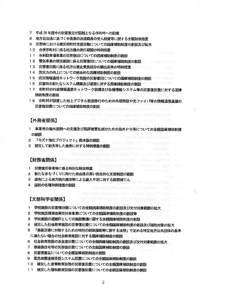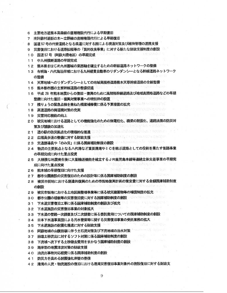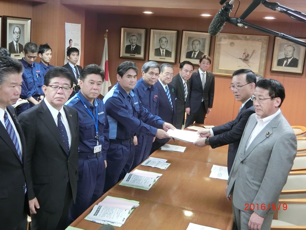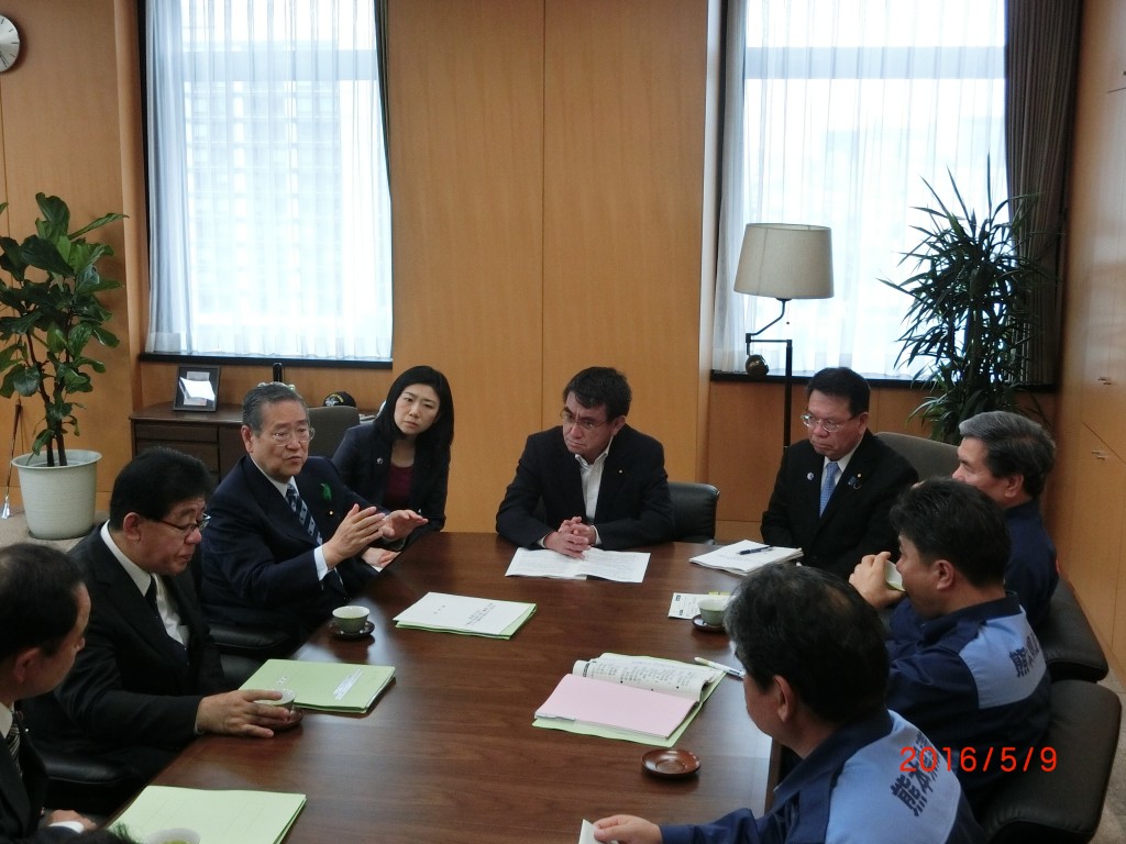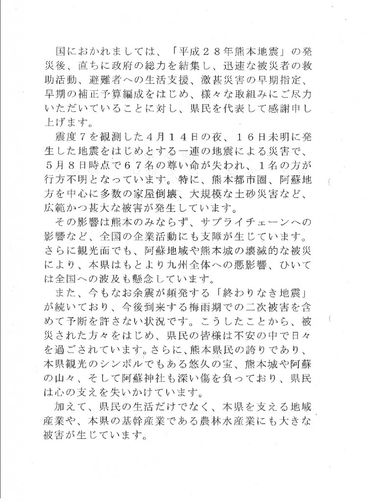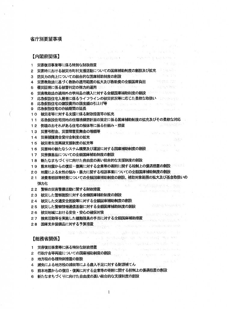 5月9日、蒲島熊本県知事、松田県議会議長、前川自民党県連幹事長と県選出国会議員の会「チーム熊本」で、官邸で総理、官房長官、各省庁で森山農水大臣、石井国交大臣、徳山国交事務次官、河野防災担当大臣、高市総務大臣、馳文科大臣、丸川環境大臣、塩崎厚労大臣、自民党本部で自民党谷垣幹事長、二階総務会長、に「平成28年熊本地震からの復旧・復興に係る特別の処置を求める要望」を申し入れに行きました。