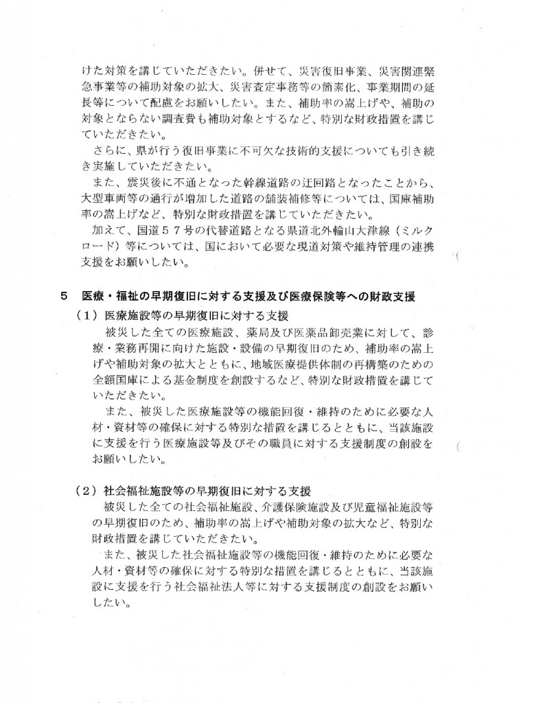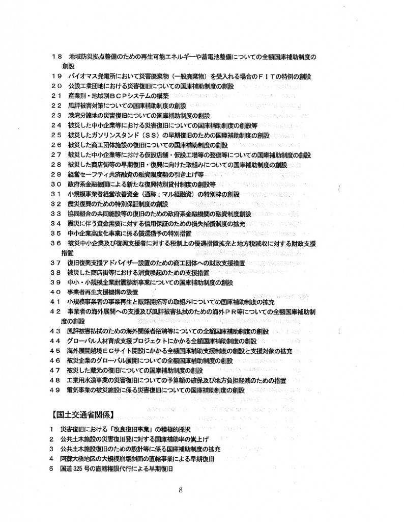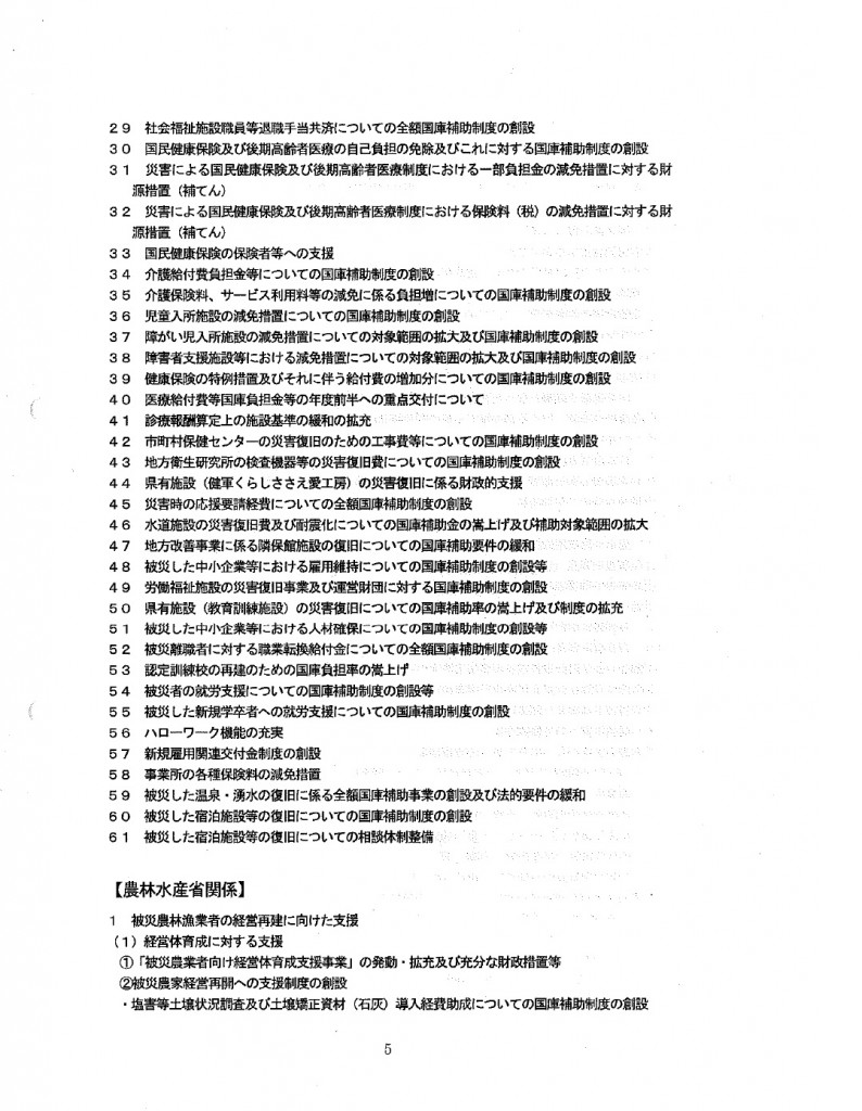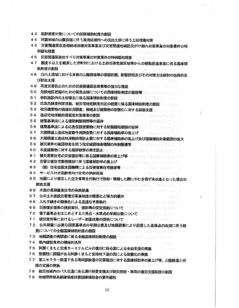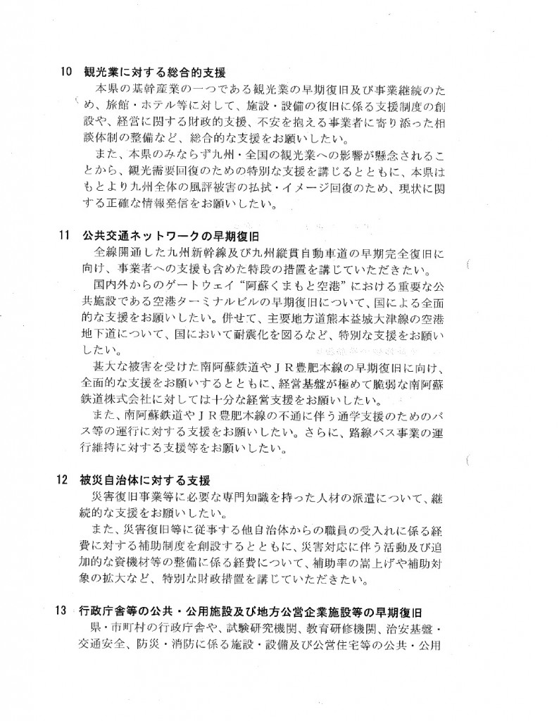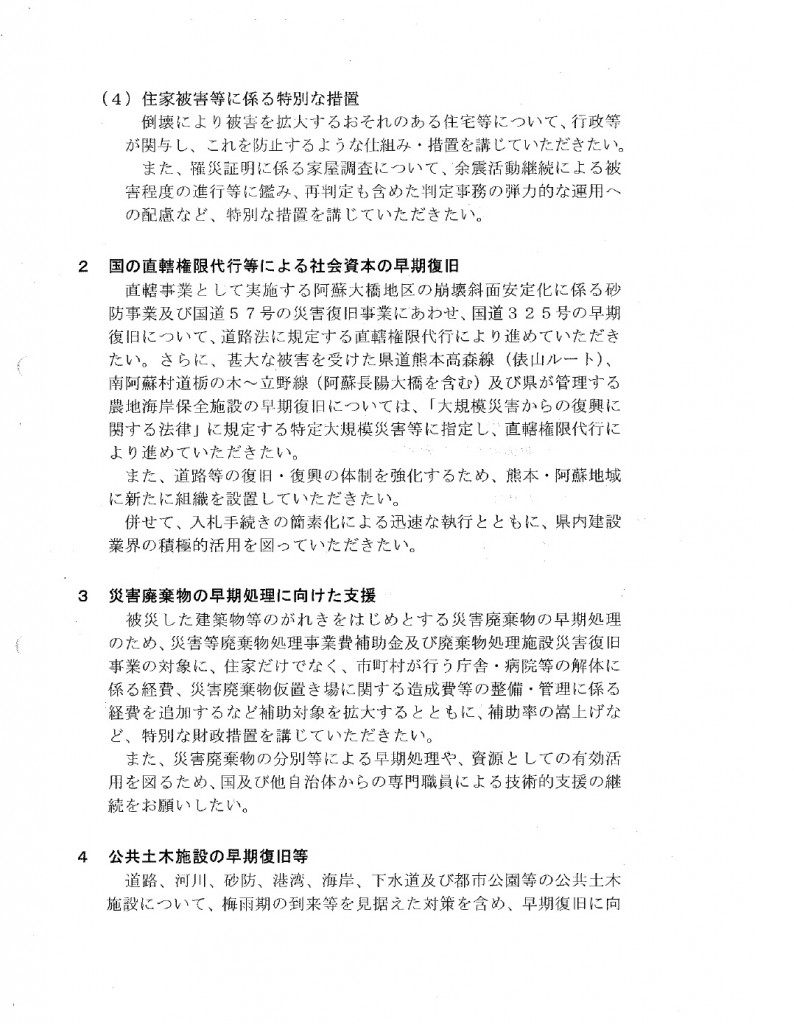 5月9日、蒲島熊本県知事、松田県議会議長、前川自民党県連幹事長と県選出国会議員の会「チーム熊本」で、官邸で総理、官房長官、各省庁で森山農水大臣、石井国交大臣、徳山国交事務次官、河野防災担当大臣、高市総務大臣、馳文科大臣、丸川環境大臣、塩崎厚労大臣、自民党本部で自民党谷垣幹事長、二階総務会長、に「平成28年熊本地震からの復旧・復興に係る特別の処置を求める要望」を申し入れに行きました。