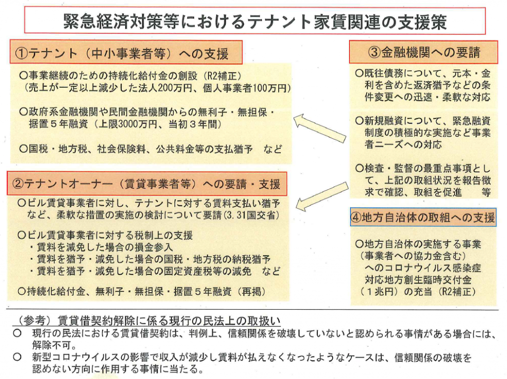 新型コロナウイルス感染症拡大により影響を受けている飲食店など賃料などの固定費の支払いが困難な状況になっている状況で、中小企業者等(テナント)への支援、及びテナントオーナー(賃貸事業者等)への要請・支援策が国土交通省より発出しております。