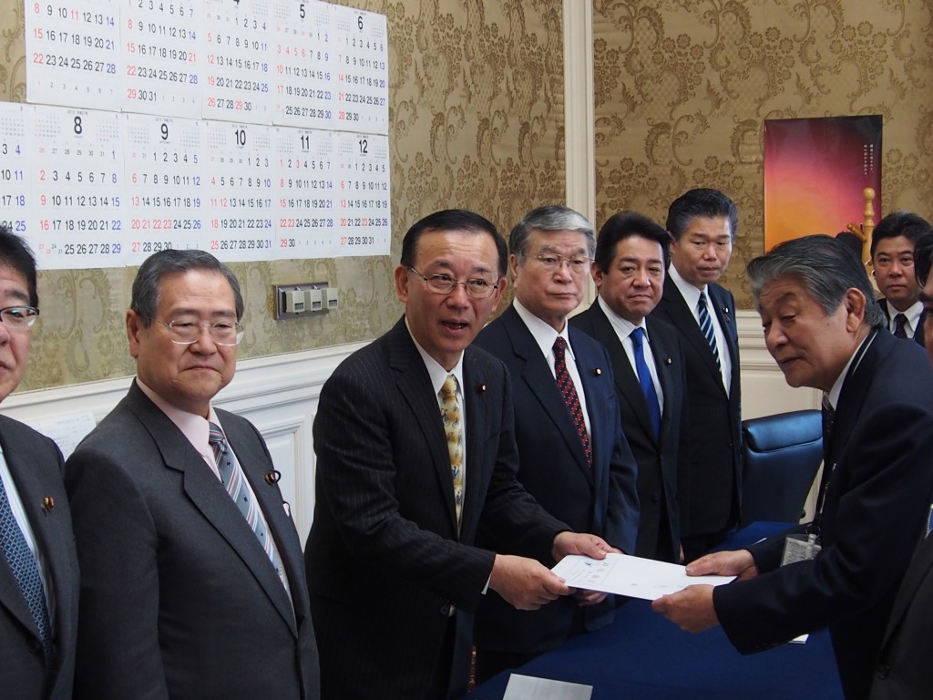 本日、2月4日(水)自民党熊本県連役員、九州県議会議長会の各県議会議長の皆様方と自民党熊本県選出国会議員とで、TPP協定交渉、農協改革に関する要望活動を自民党三役をはじめ、石破大臣、あべ農水副大臣に行いました。