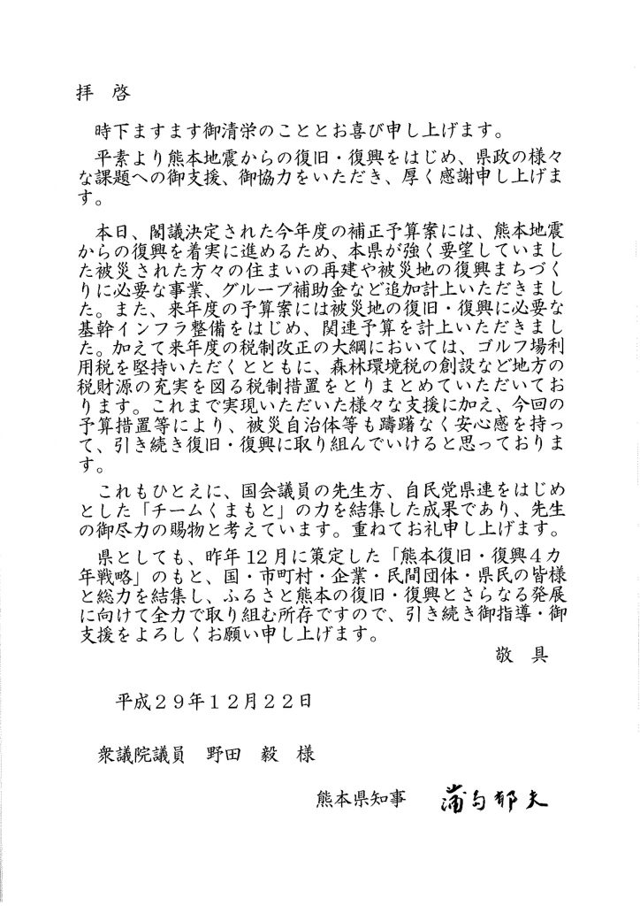 活動報告 蒲島熊本県知事来所2017.12.22活動報告12月22日(金)、蒲島熊本県知事が「熊本地震の復旧・復興支援等に係る御礼」で議員会館の事務所に来訪されました。その後、自民党役員への挨拶に県選出国会議員で同席致しました。野田たけし公式LINE登録はこちらから野田たけし公式Twitterはこちら 『PRIME NEWS』生放送出演情報前の記事年頭のご挨拶次の記事